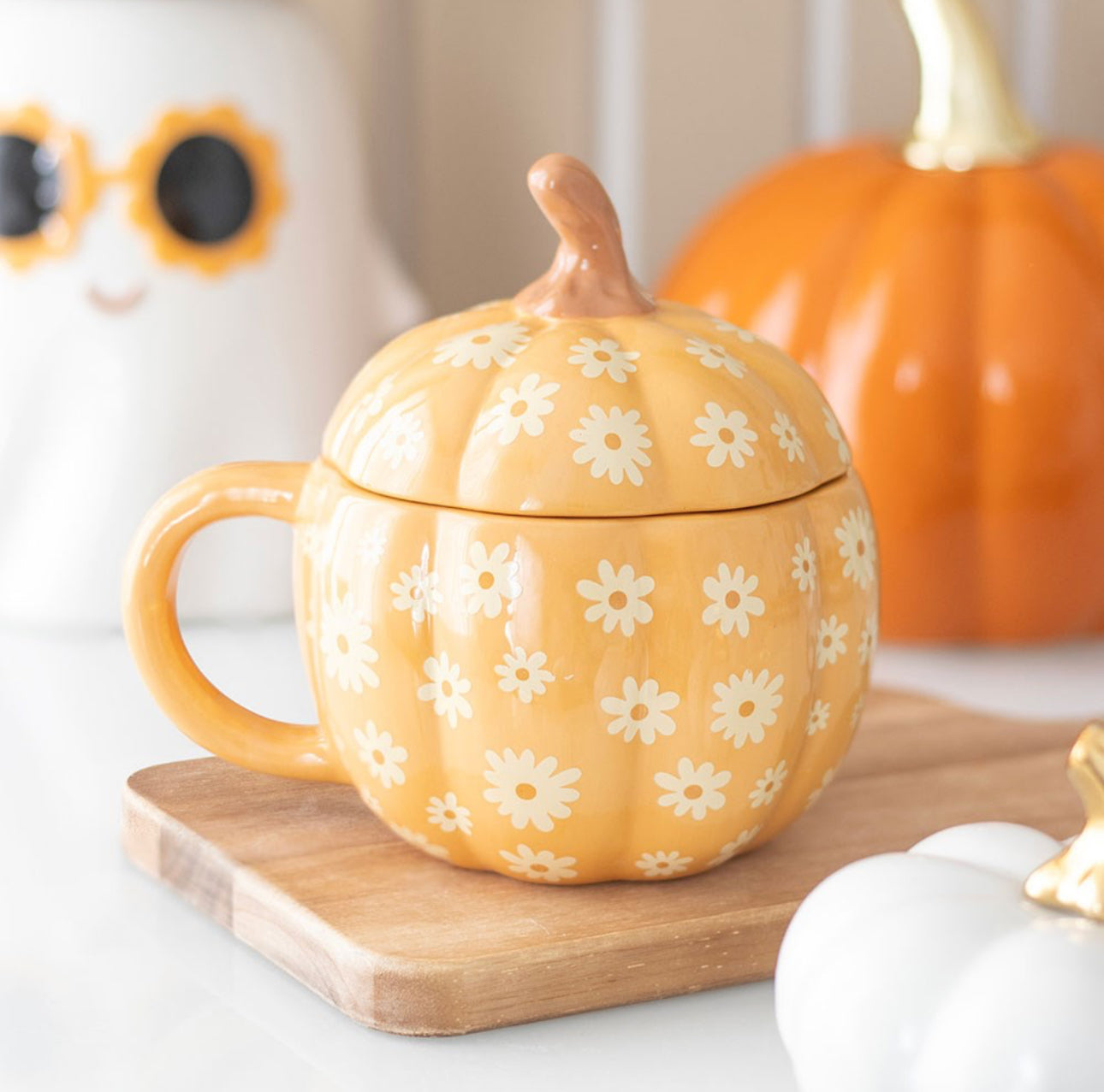 Bring a touch of autumn charm to your drinkware with this orange pumpkin-shaped ceramic mug, featuring a groovy floral design. The stylish lid helps to keep your favourite brew warm, making it the perfect mug for sipping spiced lattes, teas, or hot chocolates throughout autumn and Halloween. A unique addition to anyone who enjoys quirky homeware. 500ml capacity. Not suitable for microwave use. Handwash only. Designed by Something Different Wholesale and part of the Groovy Ghosts collection of funky Halloween gifts and home decor.