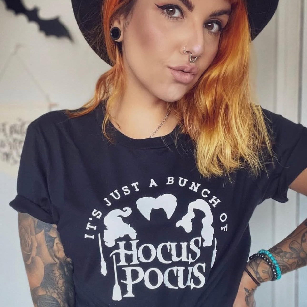 Get ready for spooky season with our Hocus Pocus T-Shirt. With its spooky witch vibes and alternative fashion, this shirt is perfect for adding a touch of gothic flair to your summer wardrobe. Don't be afraid to channel your inner emo with this playful and stylish tee!