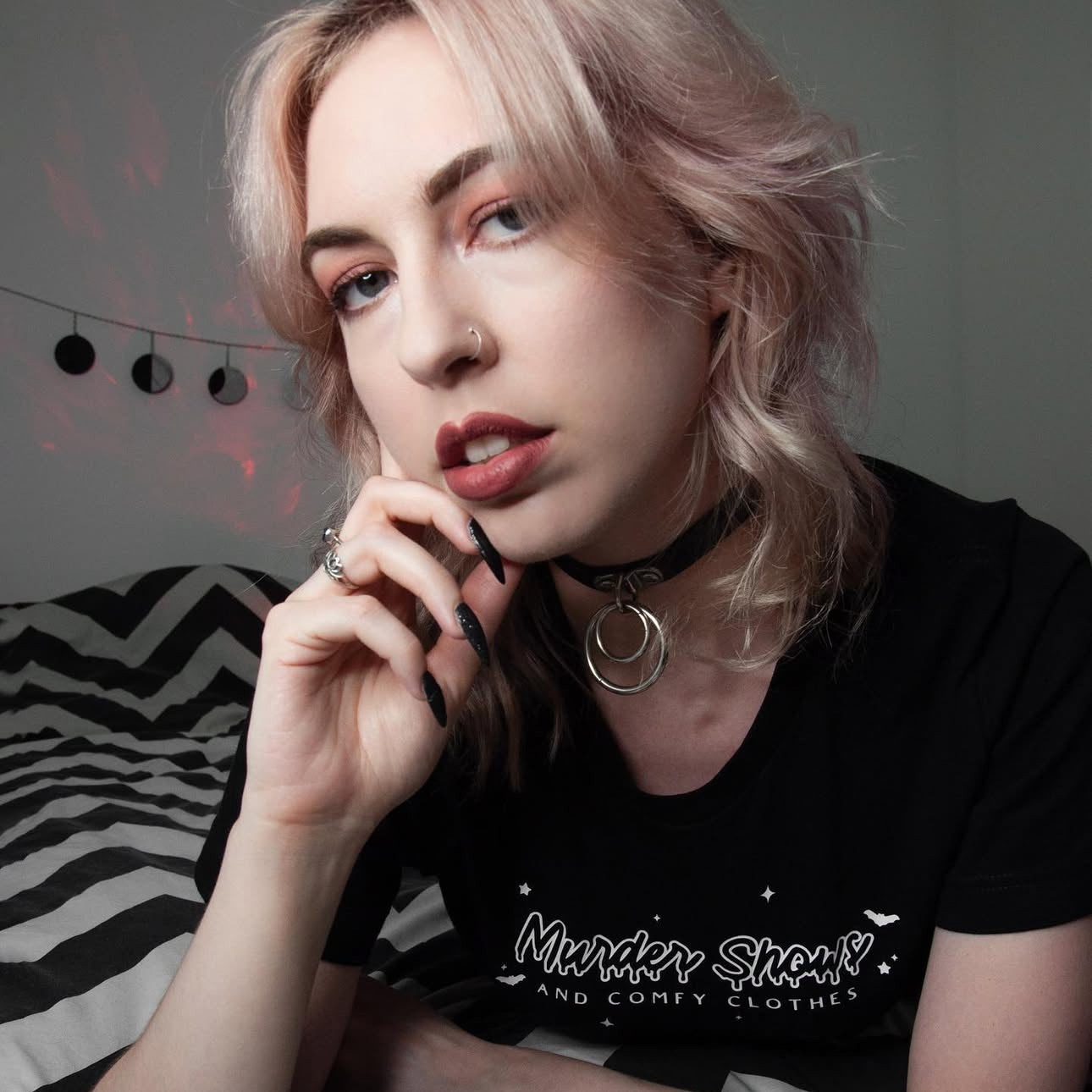 "Indulge in your love for murder shows and comfy clothes with this t-shirt. Perfect for emo, gothic, or alternative fashion enthusiasts, this tee is ideal for spooky summers or cozy nights in. A unique addition to any wardrobe.