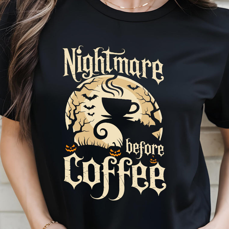 Fuel your caffeine addiction while showing off your love for the spooky season with our Nightmare Before Coffee T-Shirt! Perfect for coffee lovers and fans of the classic movie, this shirt is sure to be a hit with its quirky design and playful tone.