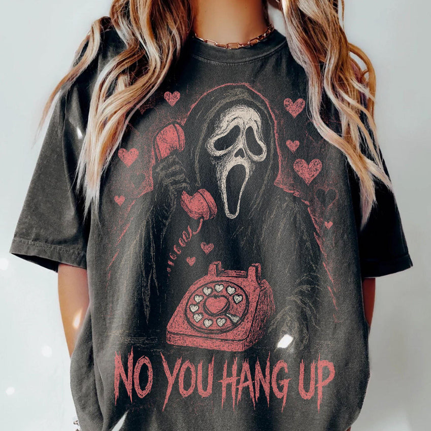 Scare up some fun this summer with our No You Hang Up t-shirt, perfect for any horror movie lover. Show off your spooky side with this playful, Scream-themed design.
