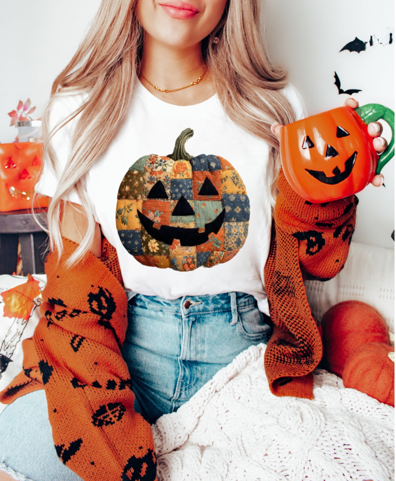 "Gear up for fall with our Patchwork Pumpkin T-Shirt! This unique design features a fun patchwork pumpkin pattern, perfect for wearing during Pumpkin Picking season!