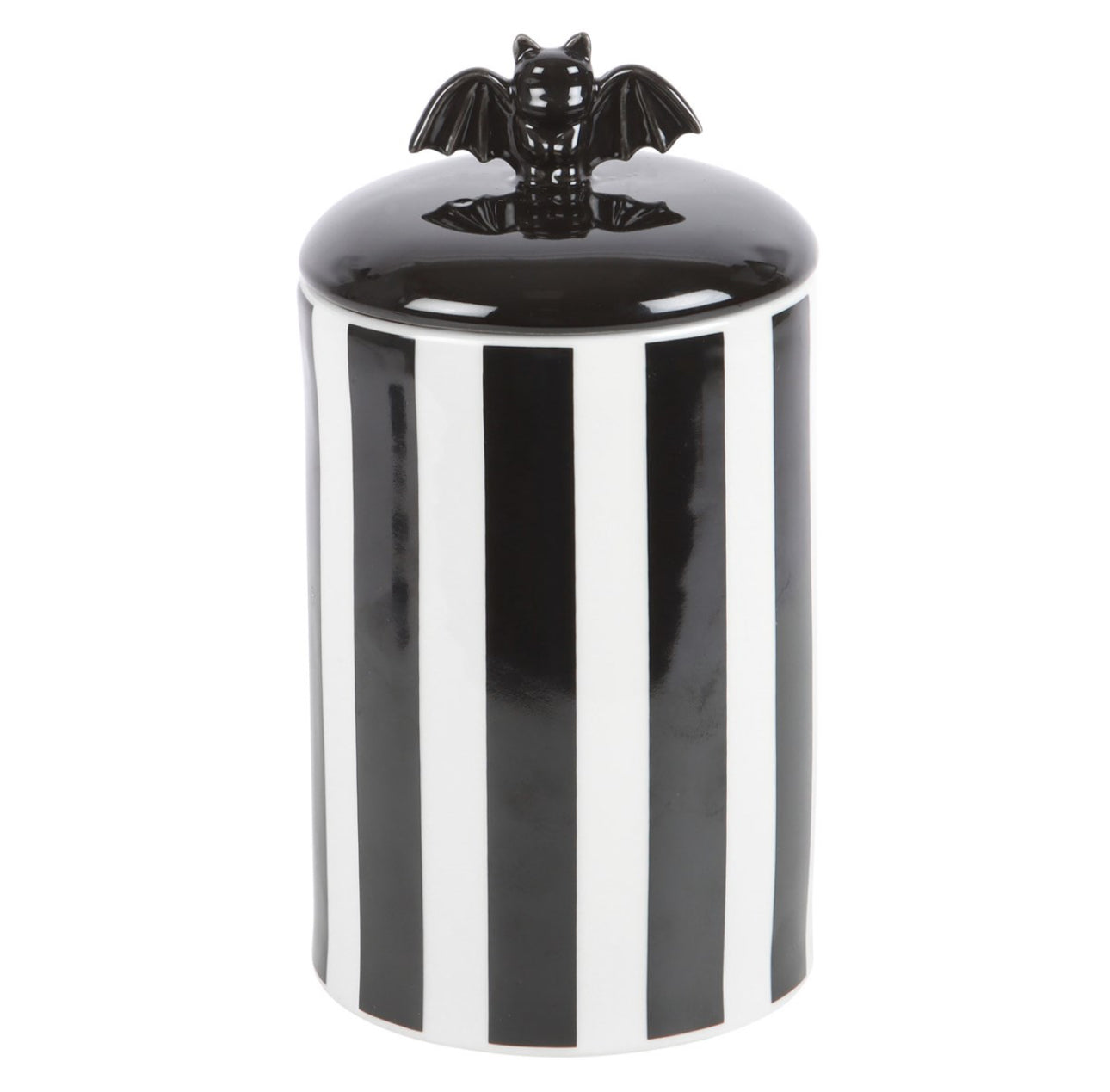 Who wants basic when you could have this? A striking black and white ceramic storage jar with a bat detail lift off lid, perfect for those who revel in bold and unique pieces. Whether it's being used for cookies or small treasured trinkets it's sure to be a beloved piece in a carefully curated home. Not suitable for microwave use. Handwash only. Food safe. Designed by Something Different and part of the Mysterious and Spooky collection of gothic homeware and accessories.
