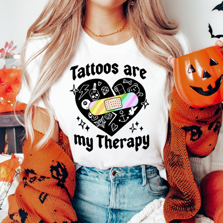 Unleash your inner punk with our "Tattoos Are My Therapy" t-shirt! Perfect for Halloween or showing off your ink in the summer. Let this shirt be a statement of self-expression, because let's be real, tattoos are the ultimate form of therapy.